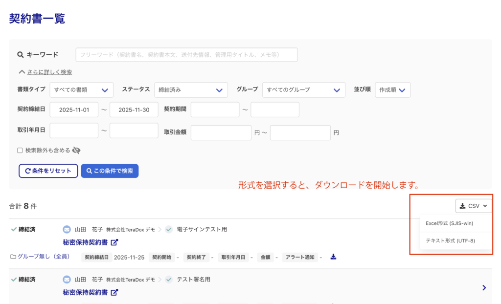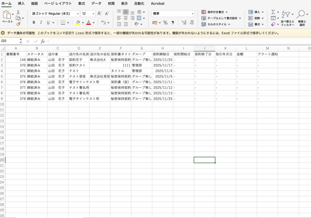 契約書一覧を、CSVデータ(Excel)で抽出することが可能です。