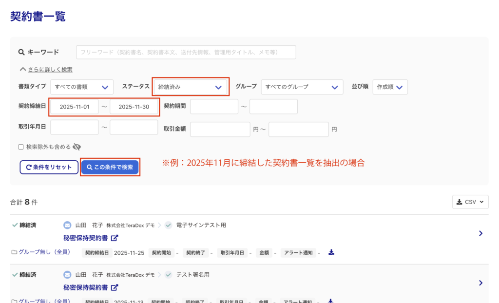 ※以下は、「2025年11月に締結した契約書」を抽出する場合の例です。